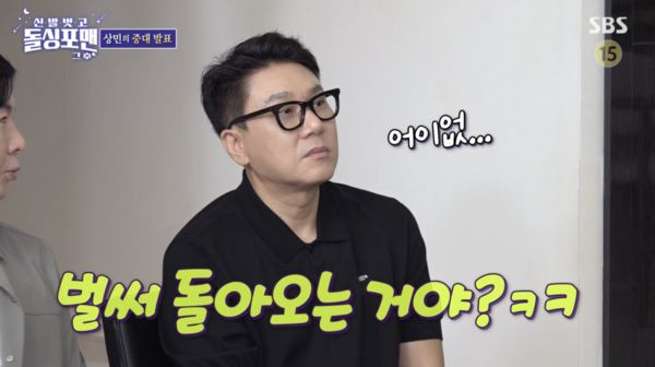 이상민은 22일 방송된 SBS 예능 프로그램 '돌싱포맨' 오프닝에서 중대 발표를 선언했다. 그의 선언에 탁재훈은 "벌써?"라며 기대감을 감추지 못했다.