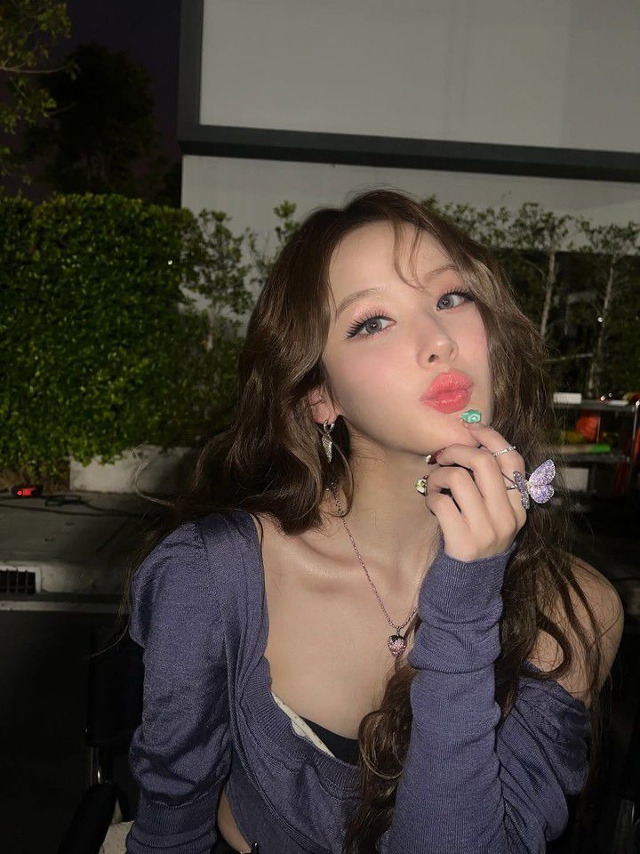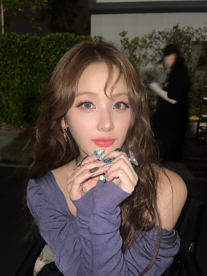밤하늘 아래에서 촬영된 모습으로, 화려한 액세서리와 포즈로 팬들의 시선을 사로잡았다.