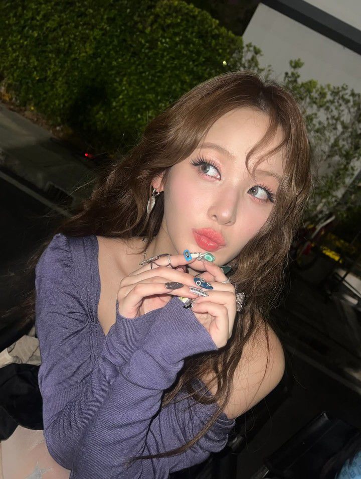 손끝에 주목하여 여러 가지 스타일리시한 반지와 네일 아트를 강조하며, 카메라를 바라보며 귀엽고 섹시한 매력을 발산했다.