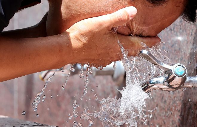 절기상 가장 덥다는 ‘대서’인 22일 대구 중구 달성공원에 설치된 음수대에서 한 시민이 세수를 하며 더위를 식히고 있다. 폭우 뒤 다시 찾아온 폭염에 전국 대부분 지역에 폭염특보가 내려졌다.