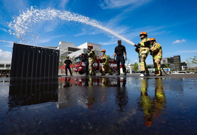 화재 진압 체험하는 학생들