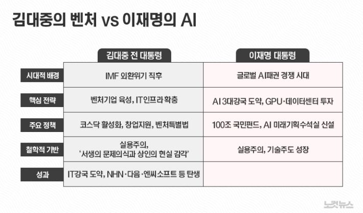 이재명 대통령이 'AI 3대 강국'을 얘기할 때 김대중 전 대통령이 불현듯 떠올랐다. 그동안 한국 경제를 지탱해온 정보통신(IT), 조선, 가전 등 모든 영역에서 후발주자인 중국이 매섭게 따라붙은 상황에서 나름의 승부수를 던진 것으로 짐작됐기 때문이다.