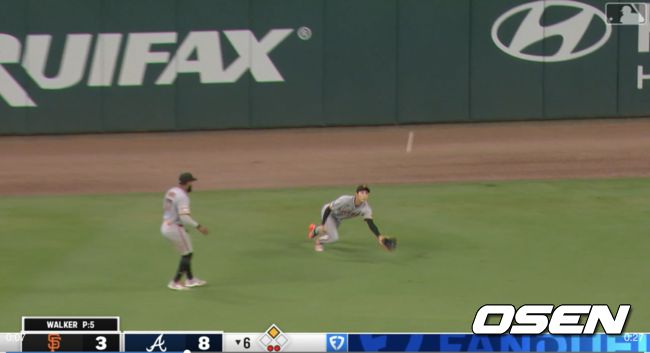 이정후는 수비에서 두 차례 아쉬운 실수를 했고, 실점을 허용했다. 애틀랜타는 5-2로 앞선 4회, 2사 1,2루에서 드레이크 볼드윈이 2루수 옆을 빠지는 중전 안타를 때렸다. 2루주자는 득점, 문제는 1루주자까지 홈까지 달려 득점에 성공했다.