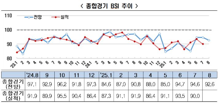 한국경제인협회(한경협)가 국내 비금융업종 상위 600대 기업을 대상으로 실시한 '2025년 8월 기업경기실사지수(Business Survey Index, BSI)' 조사 결과, 종합 BSI 전망치는 92.6으로 나타났다. 이는 7월(94.6)보다 하락한 수치로, 기준선 100을 3년 5개월 연속 밑도는 장기 부진 국면이 이어지고 있다.