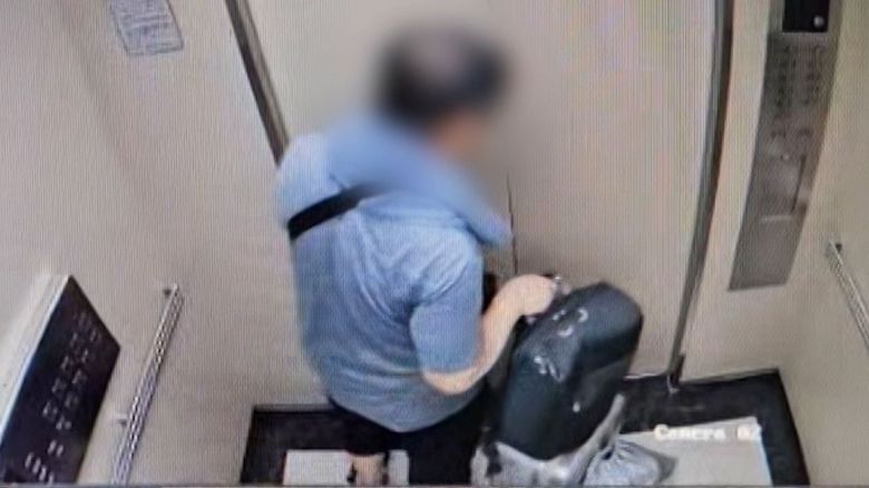 여행용 캐리어와 가방을 든 남성이 엘리베이터를 타고 아파트를 빠져나옵니다.