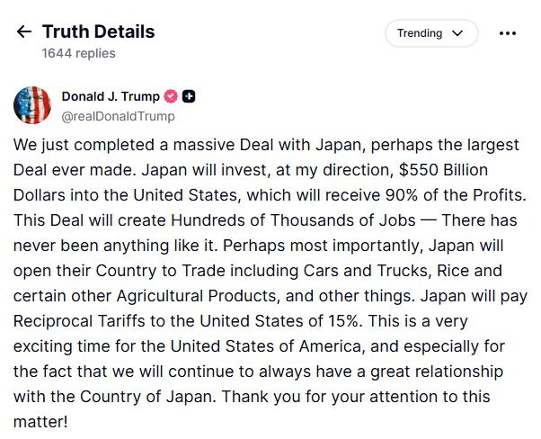 도널드 트럼프 대통령은 22일(현지시간) 자신의 사회관계망서비스(SNS) 트루스소셜에 "방금 일본과의 대규모 거래, 어쩌면 역대 최대 규모의 거래를 완료했다."라고 적었다. 상호관세는 15% 수준으로 결정됐다.