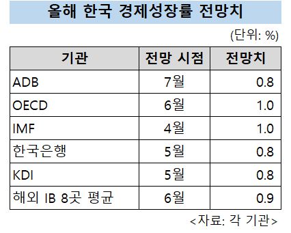 국제통화기금(IMF)과 경제협력개발기구(OECD)는 1.0%, 한국은행과 한국개발연구원(KDI)은 0.8%를 제시했다. 해외 주요 투자은행(IB) 8곳의 평균은 0.9%다.