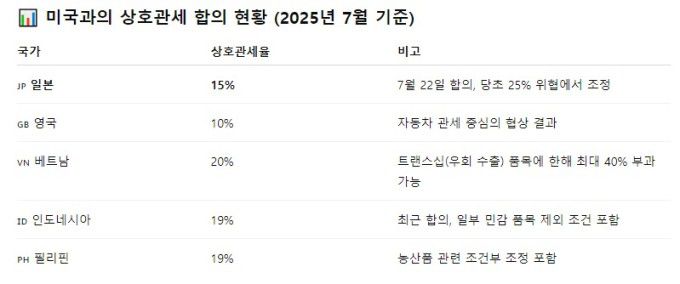 이번에 일본과 합의된 15%는 미국이 다른 국가들과 체결한 상호관세율과 비교해도 상대적으로 완화된 수준이다.