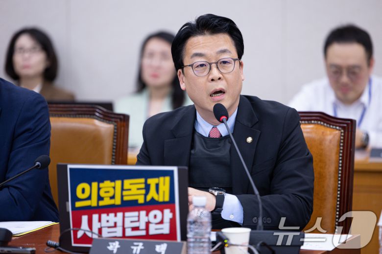 곽규택 국민의힘 의원이 14일 오전 서울 여의도 국회에서 열린 법제사법위원회 전체회의에서 방탄복을 입고 발언을 하고 있다. 2025.5.14/뉴스1 ⓒ News1 이재명 기자 |