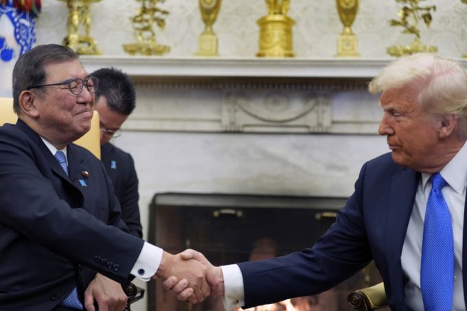 이시바 시게루(왼쪽) 일본 총리와 도널드 트럼프 미국 대통령이 2월 7일(현지 시간) 백악관 집무실에서 회담 전 악수하고 있다./AP=뉴시스 |