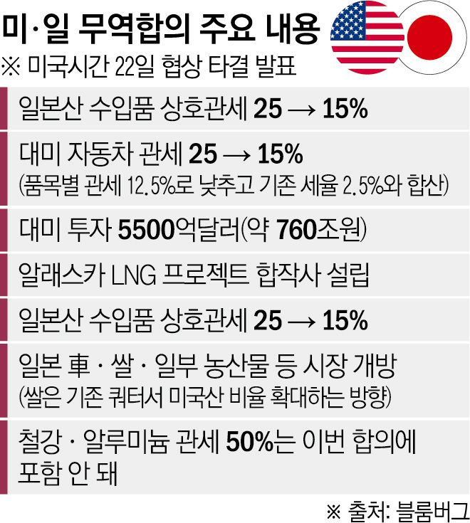 미국과 일본이 무역협상을 마무리했다. 일본은 미국에 5500억 달러(약 760조 원)를 투자하고 일부 품목에 대한 자국 시장을 개방하기로 했다. 이를 대가로 25%였던 상호관세는 15%까지 낮췄다.