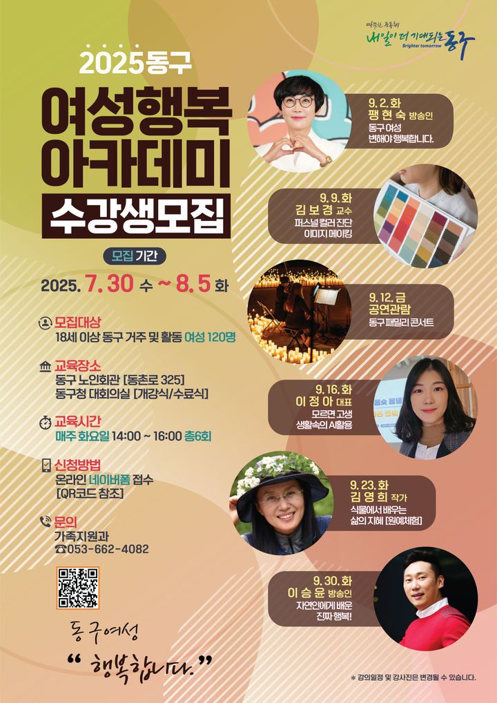 아카데미는 '동구 여성, 행복합니다!'를 주제로 9월2일부터 30일까지 매주 화요일 열린다. 프로그램은 방송인 팽현숙과 이승윤의 특강을 비롯한 퍼스널 컬러 진단, 원예체험 등으로 구성된다.