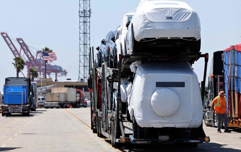 2025년 6월25일, 미국 캘리포니아 롱비치에서 신차들이 도착한 뒤 카캐리어 트럭에 실려 운송되고 있다. 도널드 트럼프 대통령이 중국과의 무역 협상을 위한 마감일을 8월 12일로 설정하는 등, 잠재적인 관세 인상 전에 이를 피하고자 하는 움직임 속에 로스앤젤레스와 롱비치 항에 새로운 물동량의 컨테이너선들이 도착하기 시작했다. AFP연합뉴스