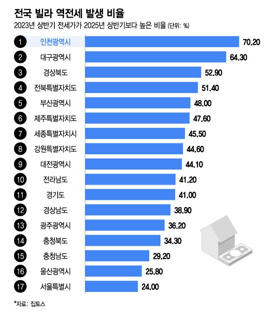 지역별 평균 전세가 변동률을 살펴보면, 대구는 -9.7%, 인천 -7.0%, 세종 -5.2%, 대전 -4.3%, 부산 -3.5%로 하락폭이 컸다. 반면 서울은 같은 기간 빌라 전세가가 2.4% 상승했고, 경기도는 0.5% 오르며 상대적으로 안정적인 모습을 보였으나, 서울 아파트 전세가가 평균 11.7% 급등한 것과 비교하면 사실상 정체 수준에 머물렀다.