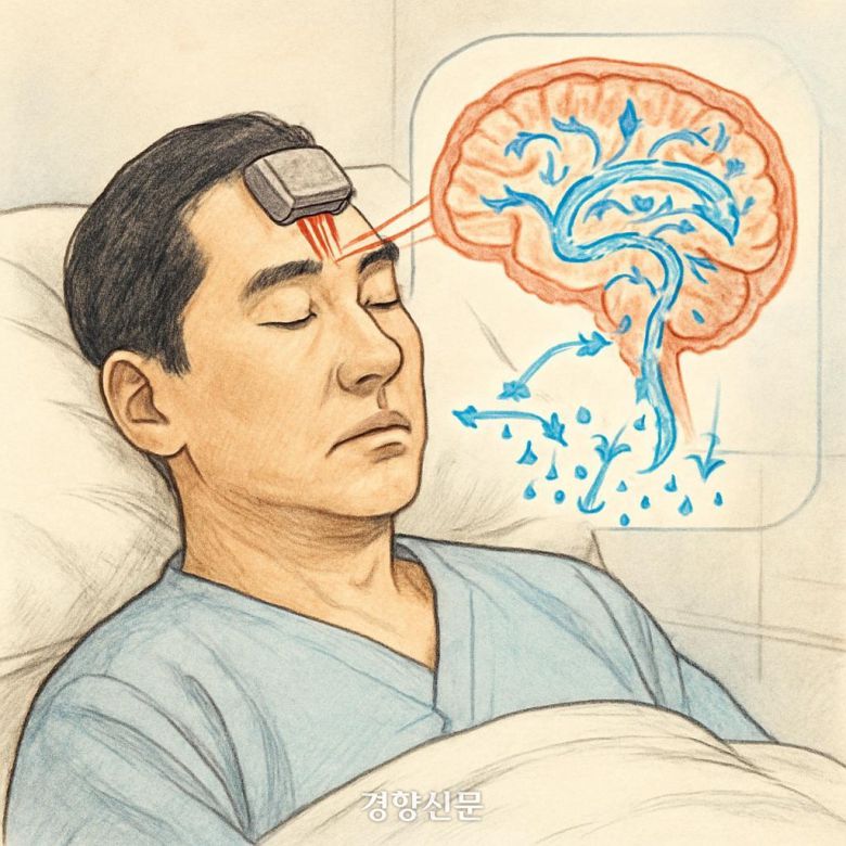 이마에 부착한 무선 근적외선 분광기가 두개골을 투과한 근적외선 광선을 통해 내부 수분량과 노폐물 세척 정도를 측정하는 방식을 묘사한 모식도. 분당서울대병원 제공 |