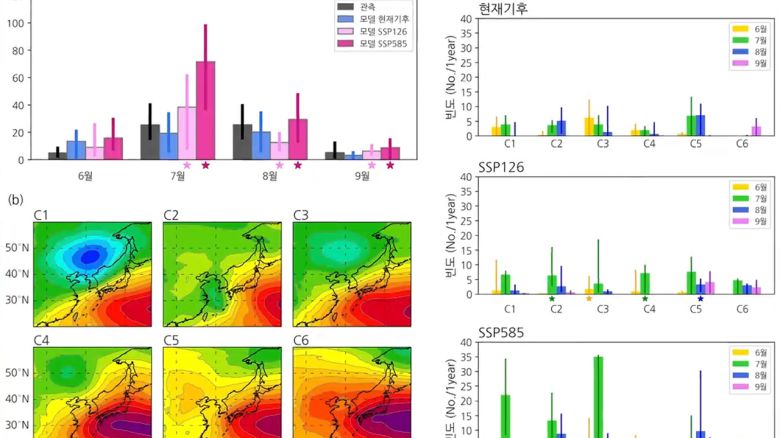 포항공대 민승기 교수와 서가영 박사 연구팀은 초고해상도 기후 모델을 이용해 탄소 배출 상황에 따른 폭우 빈도를 분석한 결과, 폭우가 집중되는 시점이 8월에서 7월로 앞당겨지고, 발생 빈도도 최대 3.7배까지 늘어날 수 있다고 밝혔습니다.