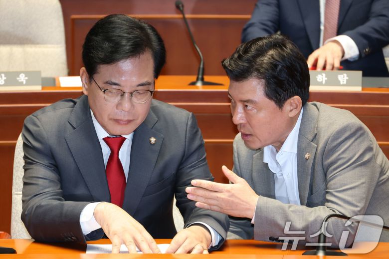 송언석 국민의힘 비상대책위원장 겸 원내대표와 구자근 의원이 23일 오전 서울 여의도 국회에서 열린 의원총회에서 대화하고 있다. 2025.7.23/뉴스1 ⓒ News1 이광호 기자 |