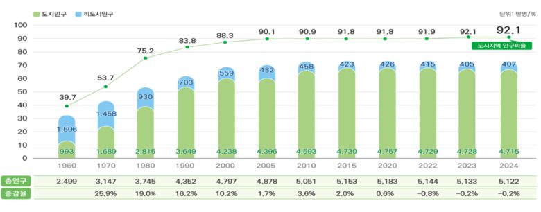 한국에서 도시지역 면적은 1만7639㎢로, 국토 면적의 16.5%를 차지했다. 도시지역 인구 비율은 2000년까지 급속하게 증가했으나 2005년 이후 90% 수준을 유지하며 성숙기에 접어든 것으로 분석된다.