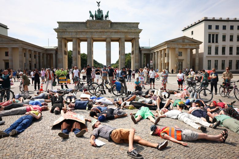지난 20일(현지시간) 독일 베를린에서 시위자들이 ‘폭염 시위’를 벌이면서 거리에 누워 있다. [게티이미지] |