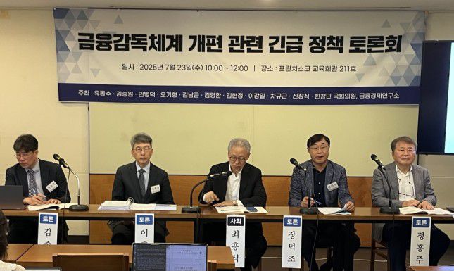 금융감독체계 개편 관련 긴급 토론회가 23일 오전 서울 중구 프란치스코 교육회관에서 열렸다./사진=정민주기자 |