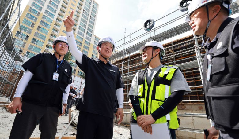 김영훈 고용노동부 장관이 취임한 지난 22일 경기 남양주시에 있는 건설공사 현장을 사전 예고 없이 방문해 건설노동자들의 안전실태를 점검하고 있다. 노동부 제공 |