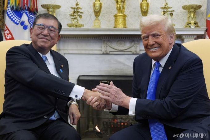 도널드 트럼프 미국 대통령과 이시바 시게루 일본 총리가 7일(현지 시간) 미국 워싱턴DC 백악관 집무실에서 양자회담에 들어가기 앞서 기념촬영하고 있다. / AP=뉴시스 |