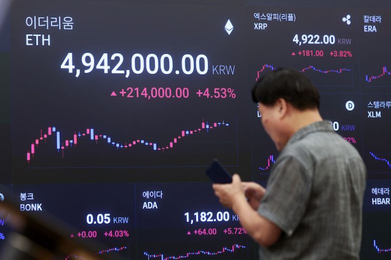 지난 7월 18일 암호화폐 거래소 업비트의 서울 강남구 고객센터 시황판에 이더리움 시세가 표시돼 있다. [사진 | 뉴시스] |