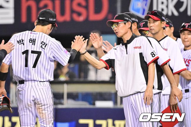염경엽 감독이 박해민과 승리의 하이파이브를 하고 있다./OSEN DB