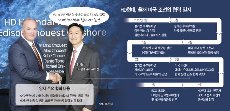 한편 HD현대는 올 들어 미국 조선업체들과 본격적으로 협업에 나서고 있다. 정기선 수석부회장은 상반기 존 필린 해군성 장관, 제이미슨 그리어 미국무역대표부(USTR) 대표를 비롯해 팔란티어, ECO 등 미국 정부 관계자 및 조선·방산업체를 만나며 글로벌 네트워크를 쌓고 있다.