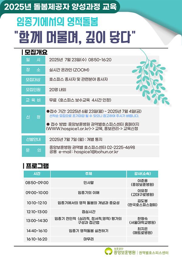 [라포르시안] 한국보훈복지의료공단 중앙보훈병원(병원장 신호철) 권역별호스피스센터(센터장 이준용)는 23일 '임종기에서의 영적돌봄-함께 머물며, 깊이 닿다'를 주제로 2025년도 호스피스 돌봄제공자 양성과정 교육을 온라인으로 개최했다고 밝혔다.
