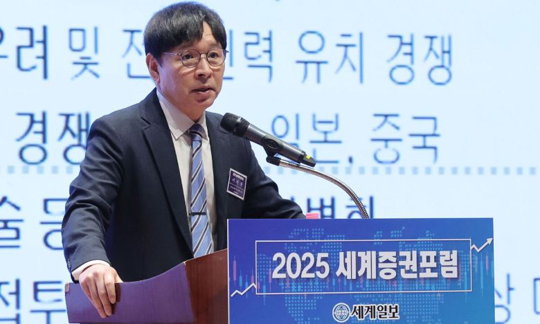 23일 서울 여의도 한국거래소에서 열린 '2025 세계증권포럼'에서 대외경제정책연구원 이시욱 원장이 기조강연을 하고 있다. 이재문 기자 |