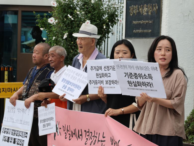 기초법바로세우기 공동행동 등 참석자들이 서울 종로구 정부서울청사 앞에서 정부 중앙생활보장위원회에 기준중위소득 현실화와 부양의무자기준 완전 폐지를 요구하는 민중생활보장위원회 기자회견을 하고 있다. 뉴시스 |