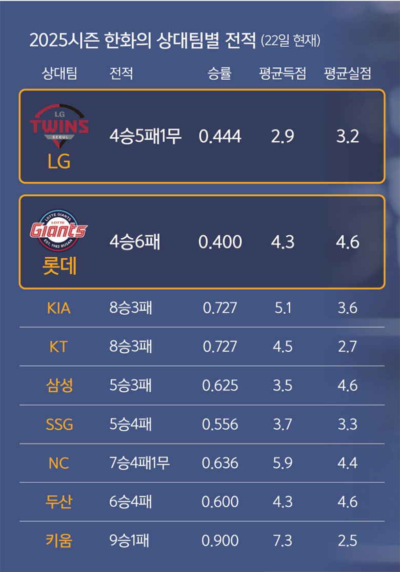 최하위 키움을 상대로 9승1패로 압도적인 우위를 보이는 등 나머지 7개 구단은 모두 상대전적에서 앞선 것과 대조적이다. 한화는 LG와 롯데를 뺀 구단 중 SSG(5승4패 승률 0.556)를 제외한 구단들은 6할 이상의 높은 승률을 기록하고 있다. LG와 롯데에 대한 한화의 약세가 더욱 눈에 띄는 이유다.