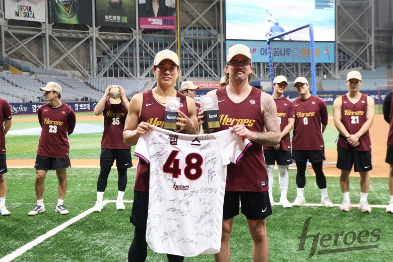 동료들과 마지막 추억을 남겼다. 키움 선수단은 23일 홈 고척 스카이돔서 훈련 전 모두 모여 웰스와 단체사진 촬영 및 인사를 나눴다. 주장 송성문은 선수단의 친필 사인이 담긴 유니폼과 웰스의 KBO리그 첫 승, 첫 탈삼진 기념구를 전달했다.