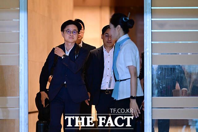 이재명 정부 초대 산업·환경부 장관들이 나란히 원전 필요성을 강조하면서 이재명 대통령의 에너지믹스 정책이 탄력을 받을 전망이다. 김정관 산업통상자원부 장관이 23일 미국 출장을 위해 인천국제공항에 도착하고 있다. /남윤호 기자 |