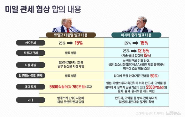 반면 이시바 시게루 일본 총리는 "농업 부문에서의 희생은 없었다"고 강조했다. 미국산 쌀 수입과 관련해 일본은 의무적으로 수입하는 최소시장접근(MMA) 물량 범위 안에서 조달 비율을 늘리기로 했다.