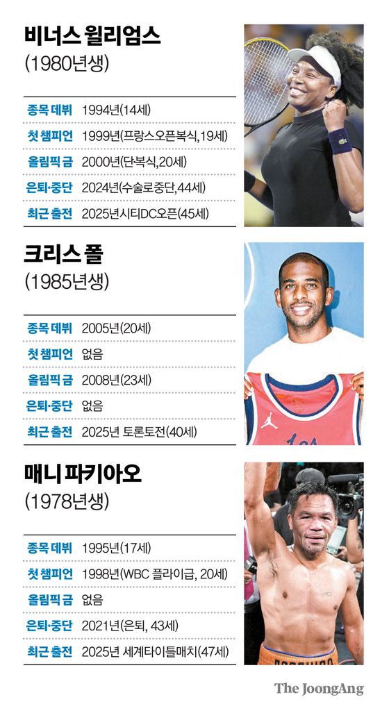 전통적으로 30대 중반이면 선수로서 황혼기인 게 프로스포츠 세계다. 현저히 떨어진 체력·스피드·반사신경 등을 극복하지 못해 늦어도 30대 후반이면 더는 버티지 못하고 은퇴했다. 하지만 최근 마흔을 넘긴 나이에도 초인적인 힘을 발휘해 10~20살 연하의 상대를 압도하는 선수들이 있다. 철저한 자기 관리와 강한 정신력으로 세월을 거스른 그들에게 은퇴란 ‘더는 뛸 수 없을 때’를 의미한다.