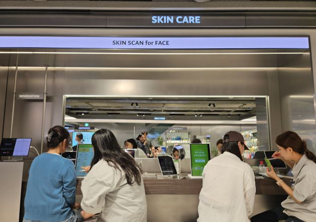 22일 오후 강남역 10번 출구 앞 ‘올리브영 센트럴 강남 타운’ 지하 1층. 내외국인 고객들이 화장품 쇼핑에 한창인 가운데 코너 한쪽에선 뷰티 컨설턴트 두 명이 개별 고객의 피부 진단 서비스를 진행 중이었다. 원격 줄서기 시스템으로 현장 예약을 한 뒤 체험 순서가 다가오자 담당 뷰티 컨설턴트가 진단 기기로 볼과 눈가 등 얼굴 촬영을 시작했다. 30초 가량 흐르자 민감도·수분감·모공·주름·잡티·피지 등 항목별 현재 피부 상태가 그래프로 나타났다.