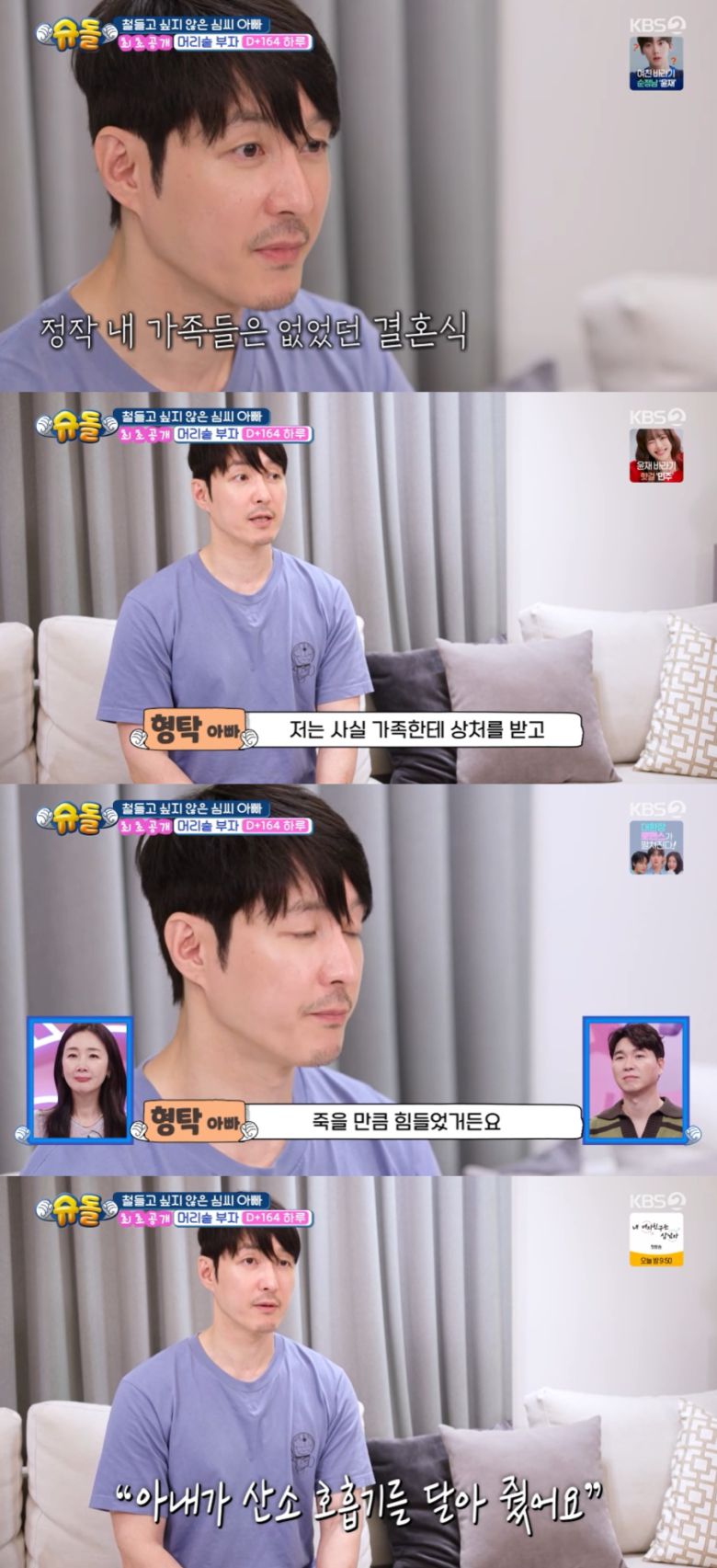 특히 심형탁은 "제가 상처가 많다 보니까. 그 상처가 많아서 죽고 싶을 만큼 힘들 때 산소호흡기를 달아 준 여자라고 생각한다. 근데 산소 호흡기까지 달아주고 제가 숨 쉬고 살만하니까 저한테 삶의 영양제 하루를 낳아준 것 같다"라며 아내에 대한 고마움을 전했다.