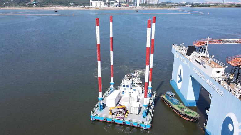 바지선 귀퉁이에는 길이 32m, 직경 90㎝의 기둥형 다리를 설치해 해저에 고정할 수 있어서, 파도의 영향을 거의 받지 않을 것으로 기대됩니다.