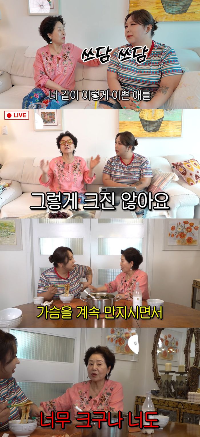이후 라면을 끓여 먹던 중 다시 풍자의 팔뚝을 만진 선우용여는 실수로 풍자의 가슴에 손을 얹는 행동을 보였고 풍자는 “거기는 가슴이다”라고 말했다.