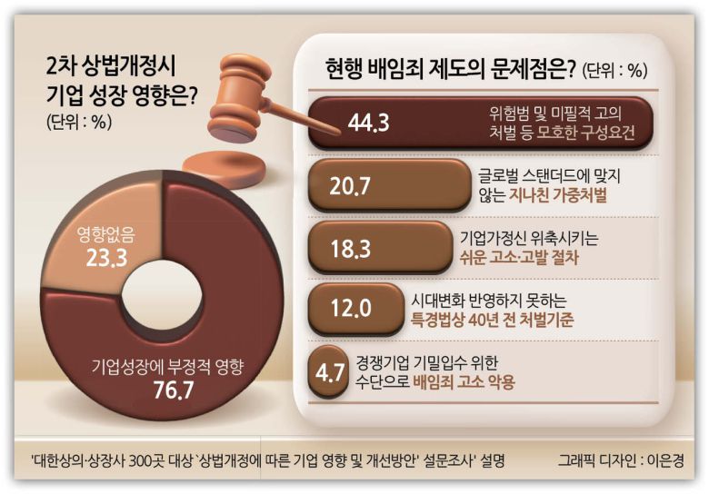 상의는 “이중 특경법 배임죄는 주요국 중 유일하게 우리나라에만 있는 가중처벌 규정으로, 처벌 기준인 5억원·50억원은 40년 전 제도 도입 당시(1984년)와 동일해 시대변화를 반영하지 못하고 있다”고 주장했다.