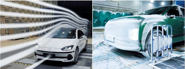 현대차·기아는 23일 미디어랩투어 행사를 통해 화성 남양연구소를 공개했다. 공력시험동에서는 아이오닉 6 차량으로 유동 가시화 시험이 진행되고 있으며(왼쪽) 환경시험동 강설챔버에선 아이오닉 9 차량에 강설 시험이 이뤄지고 있다. [현대차·기아 제공] |
