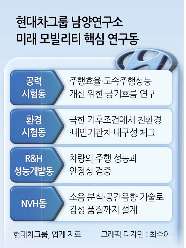이날 공개된 시험동은 ▷공력시험동 ▷환경시험동 ▷R&H성능개발시험동 ▷NVH시험동 등이다. 이곳 시험동은 차량의 승차감과 효율성을 체크하고, 여러 극한의 상황에서도 주행성능과 정숙성을 확보하기 위한 연구를 진행한다.