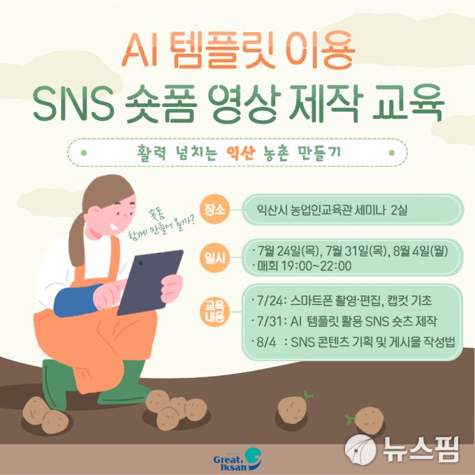 익산시농업기술센터는 총 3회 9시간 과정으로 '인공지능(AI) 템플릿 활용 SNS 숏폼 영상 제작' 교육을 진행한다.