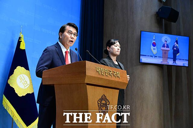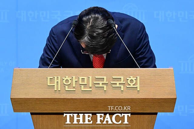 [더팩트ㅣ국회=남윤호 기자] 윤상현 국민의힘 의원이 24일 오전 서울 여의도 국회 소통관에서 기자회견을 열고 최근 논란이 된 '자유공화 리셋코리아' 토론회 등에 대해 대국민 사과하고 있다.