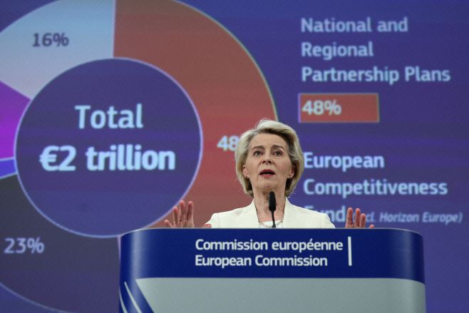 우르줄라 폰데어라이엔 유럽연합(EU) 집행위원장이 16일(현지시간) 벨기에 브뤼셀에서 향후 7년간 EU 예산안과 관련한 기자회견을 갖고 있다./로이터·연합 |