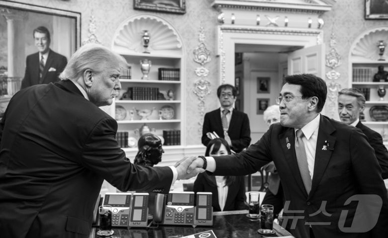 도널드 트럼프 미국 대통령이 백악관 집무실에서 23일(현지시간) 아카자와 료세이 일본 경제재생상과 양국 무역협상을 타결 후 악수를 하고 있다. (댄 스카비노 백악관 부비서실장 X, 재판매 및 DB금지) 2025.7.24/뉴스1 ⓒ News1 김진환 기자 |