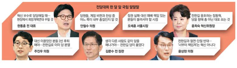 한 전 대표는 다음달 22일 열릴 전당대회에 불출마하겠다는 뜻을 밝히며 현장에서 국민주권 정치를 실천하겠다고 밝혔다. 이를 두고 일각에선 내년 지방선거 또는 국회의원 재·보궐 선거에 직접 등판하는 게 아니냐는 전망도 나온다. 이날 오세훈 서울시장, 홍준표 전 대구시장 등도 쓴소리를 하면서 당의 변화를 촉구했다.
