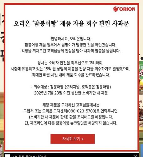 유통 중인 참붕어빵 제품은 15억원 상당이라고 알려졌지만, 제품 형태가 다양한 만큼 정확한 회수 대상 개수를 알기는 어렵다고 오리온은 설명했다.